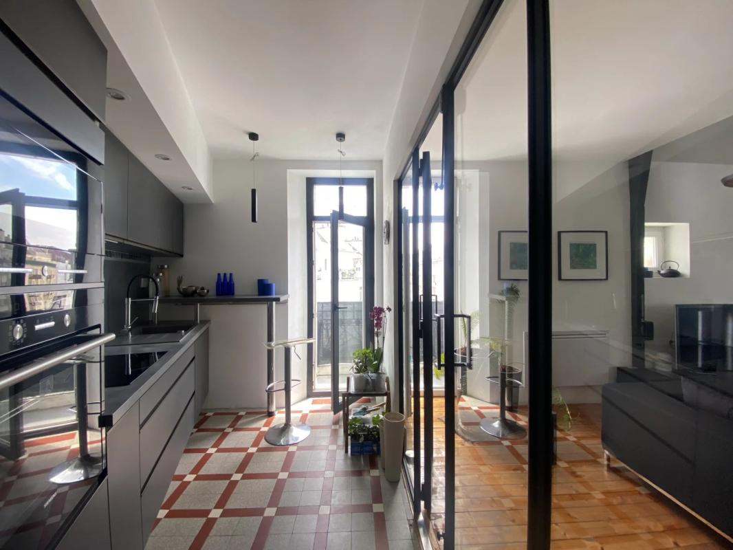 Ce grand appartement atypique de près de 100 m2 habitables et 147m2 au sol, se compose d’un séjour sur parquet massif ancien, d’une cuisine A/E séparée par une verrière en métal, véritable travail d’Orfèvre ouvert sur un balconnet projetant une vue dégagée sur la ville.
