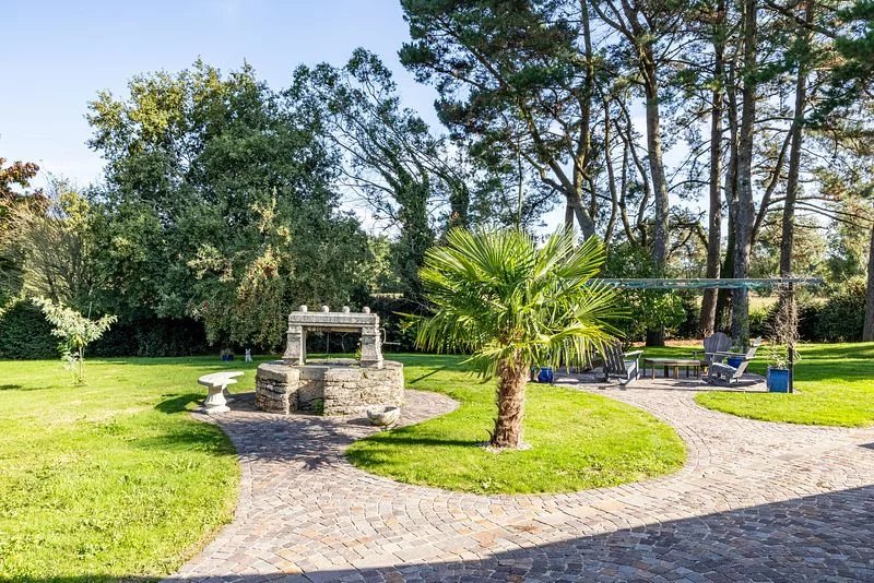 -Beau jardin paysagé doté d’un puits et bordé par une rivière.