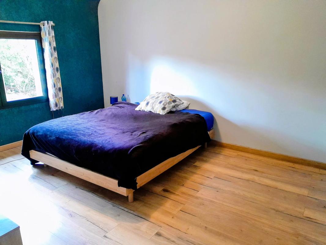 La bâtisse principale dispose d’une grande pièce de vie lumineuse de 60m² ou trône un poêle de masse rayonnant, une belle cuisine moderne équipée et aménagée, une buanderie transformable en chambre et une salle d’eau.