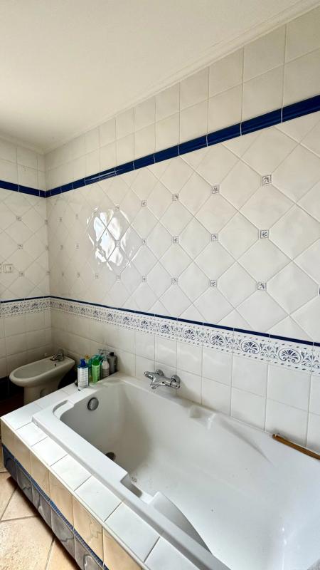 Toujours en RDC, une chambre avec salle de bain privative équipée d’une baignoire, WC.