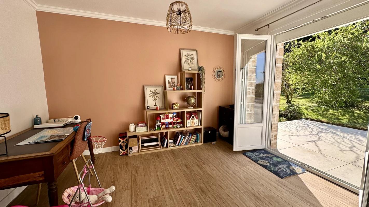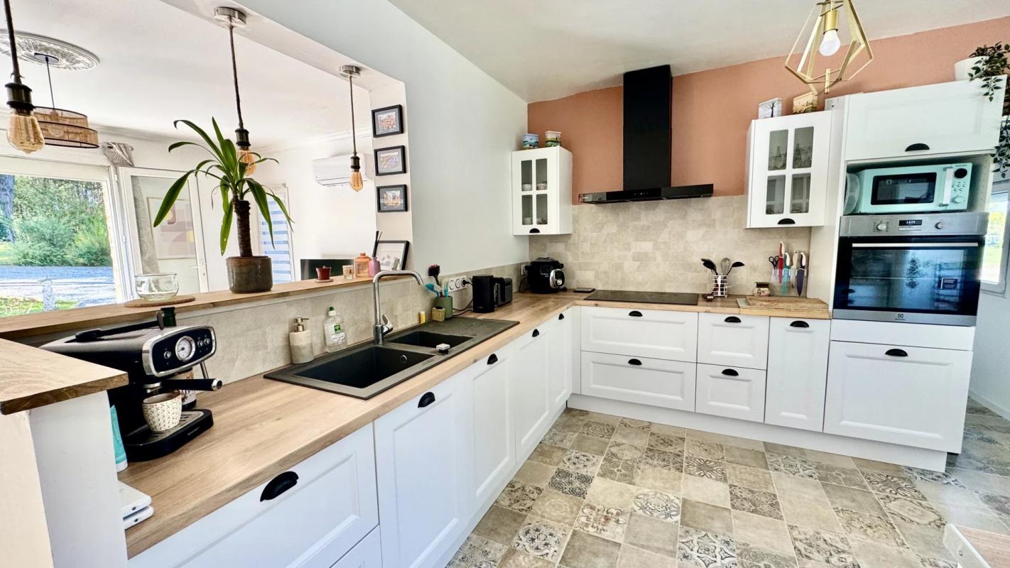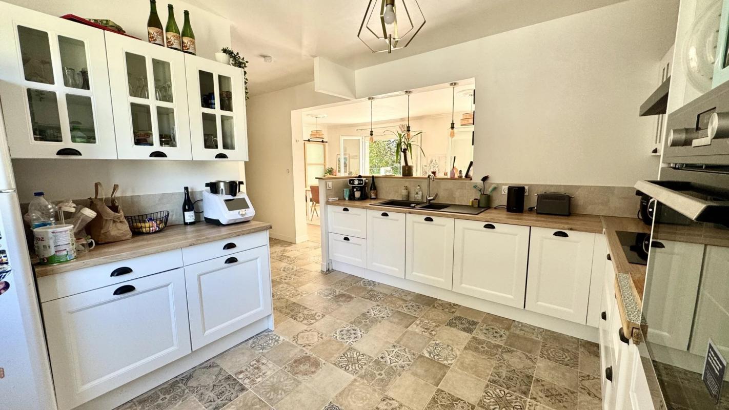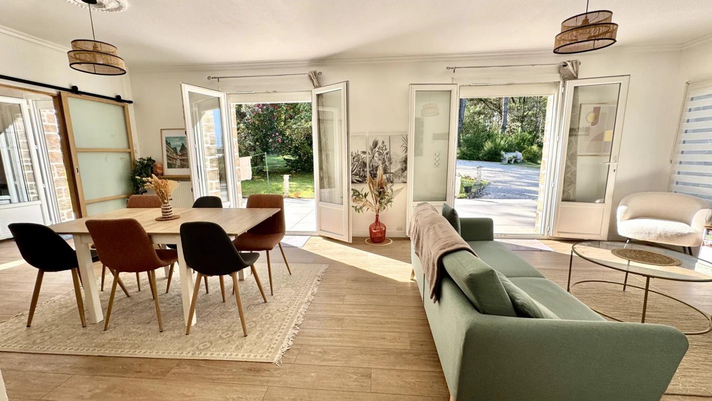 Belle maison de 143 m² habitables entièrement rénovée comprenant une entrée, cuisine ouverte équipée et aménagée, séjour-salon avec poêle à bois, chambre avec SDE privative, bureau, buanderie, WC.