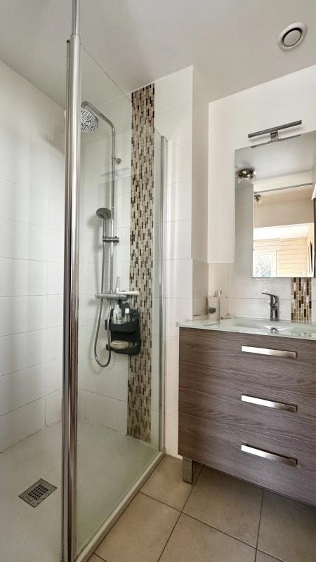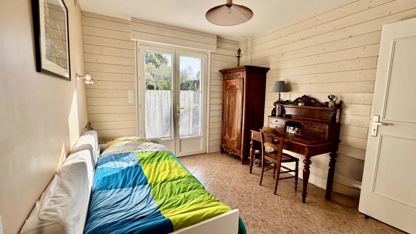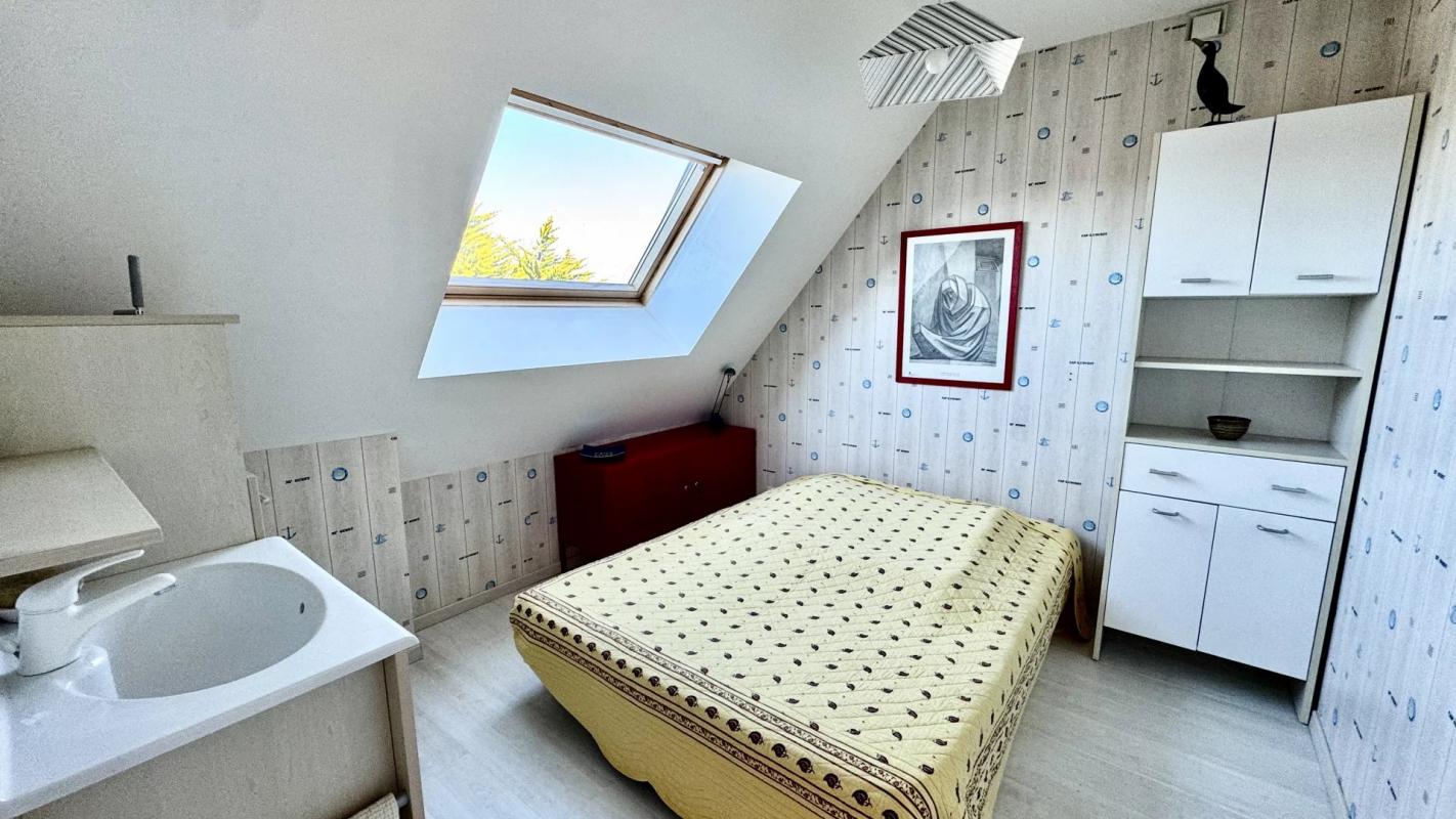 À l’étage, quatre chambres dont une très belle chambre avec dressing aménagé et vue sur le golfe, une salle de bains accueillent confortablement toute la famille.