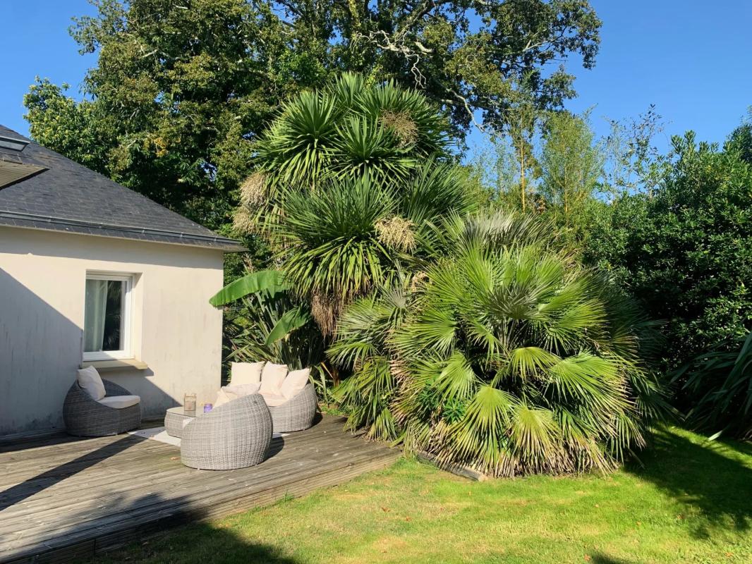 À l’extérieur, la terrasse en bois, partiellement couverte, prolonge naturellement la pièce de vie vers un jardin clos, paysagé et sans vis-à-vis.