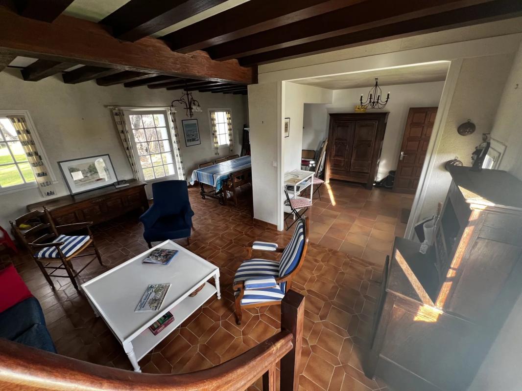La maison s’articule autour d’une pièce de vie chaleureuse d’environ 43 m², réunissant salon et salle à manger dans une atmosphère propice aux moments conviviaux. La cuisine, sobre et fonctionnelle, s’inscrit naturellement dans la continuité de cet espace.
