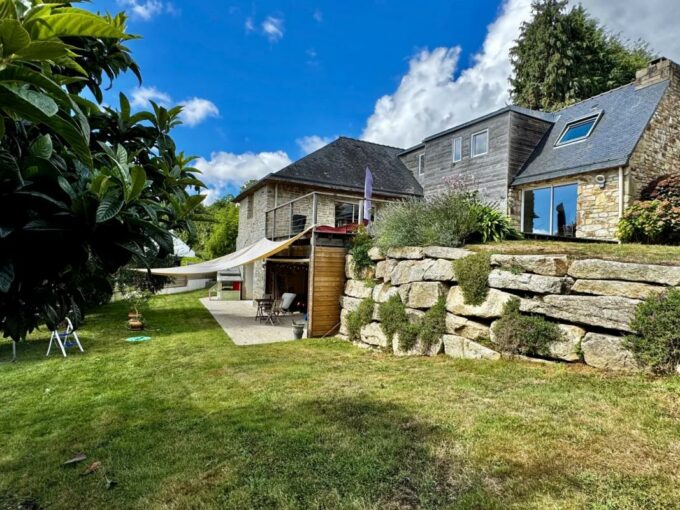 La maison se compose : d’une entrée avec placard, une belle pièce de vie avec poêle, cuisine équipée donnant sur la terrasse sans vis à vis, quatre chambres dont une au RDC avec salle d’eau privative.