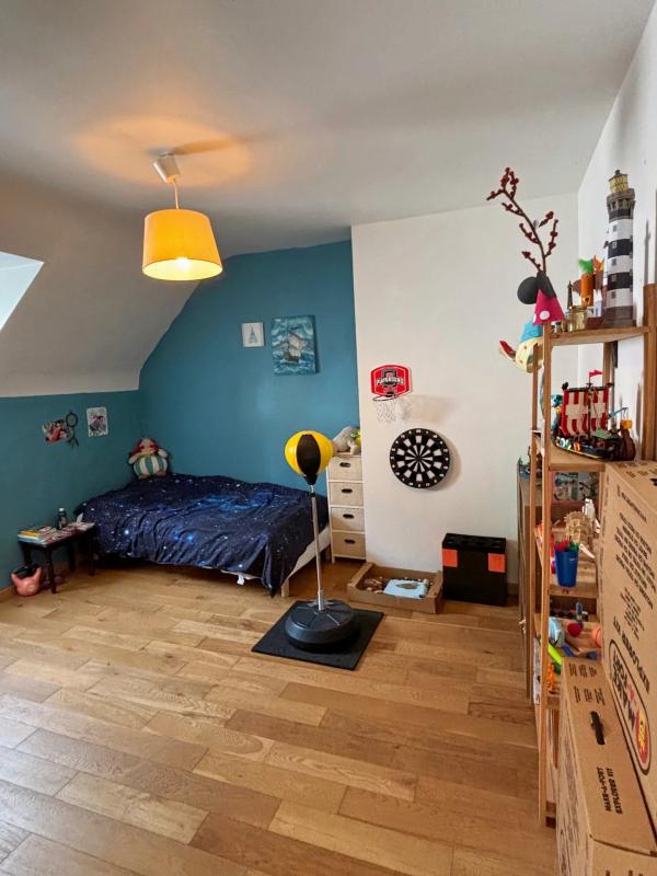Au premier étage, laissez-vous séduire par une lumineuse pièce de vie de 43 m² offrant une belle vue sur le jardin et la chapelle de Locminé, agrémentée d’un poêle, idéal pour des ambiances chaleureuses en hiver. Vous y trouverez également une grande cuisine aménagée et équipée avec îlot central, une chambre, une salle de bains et un WC séparé avec lave-mains.