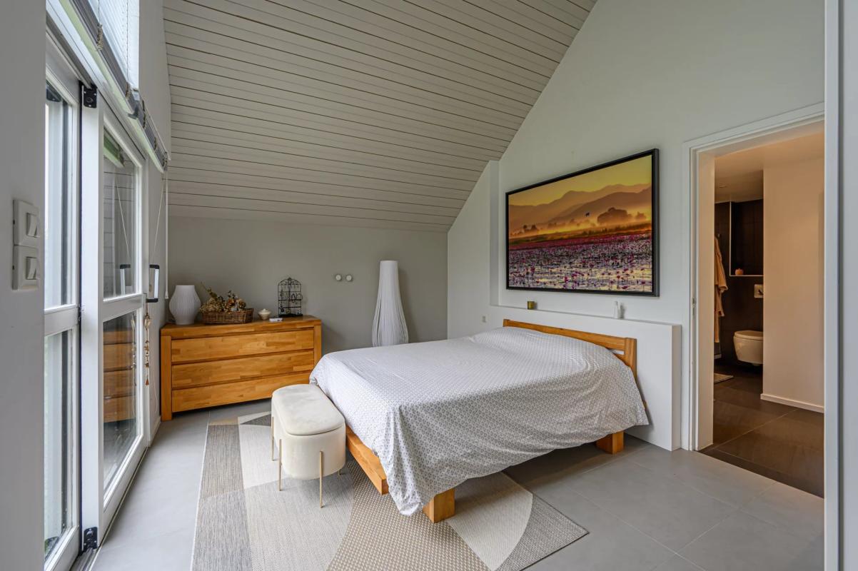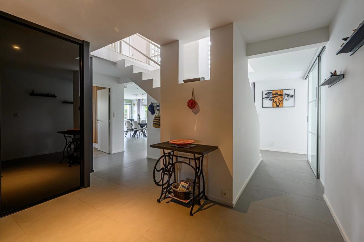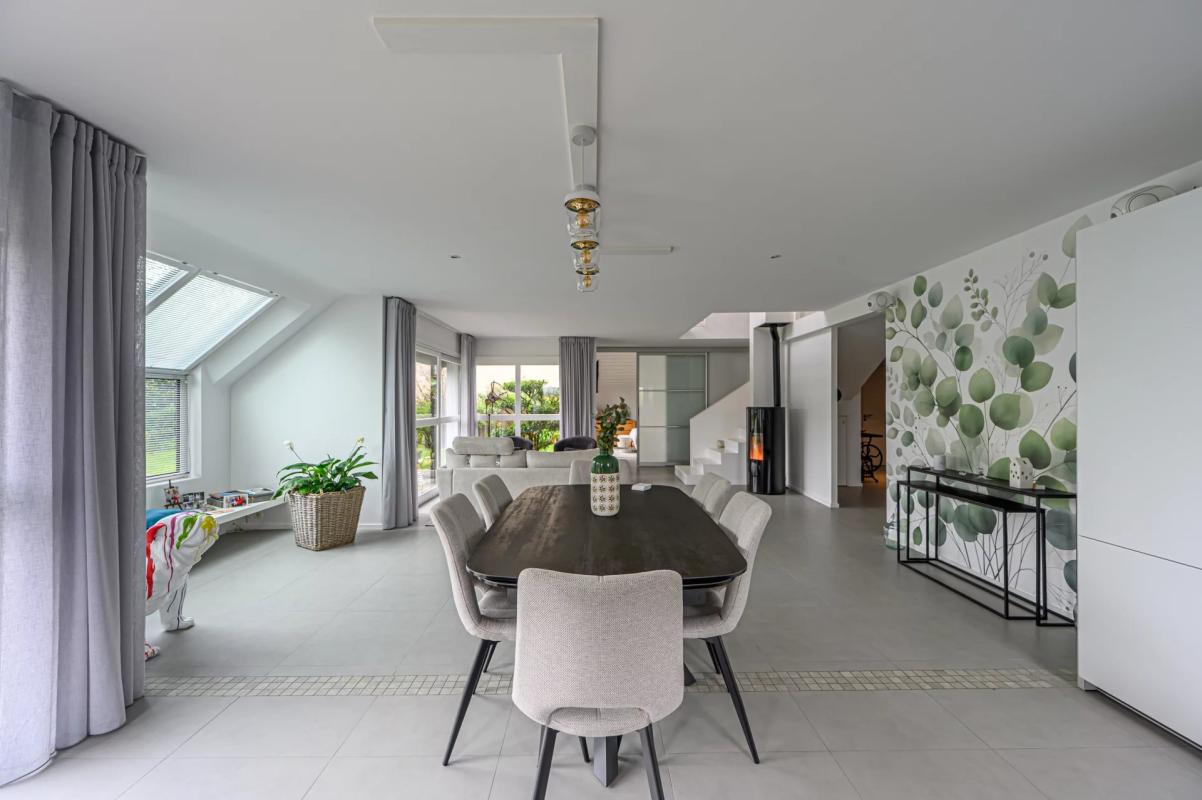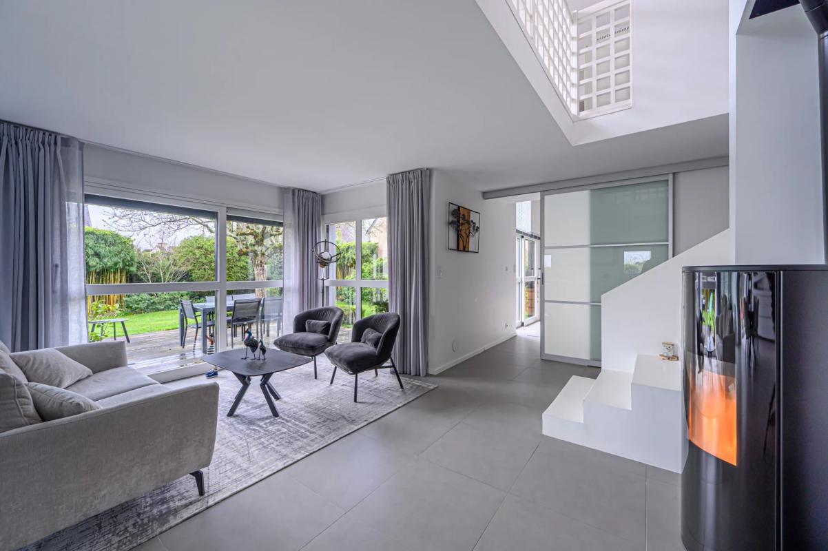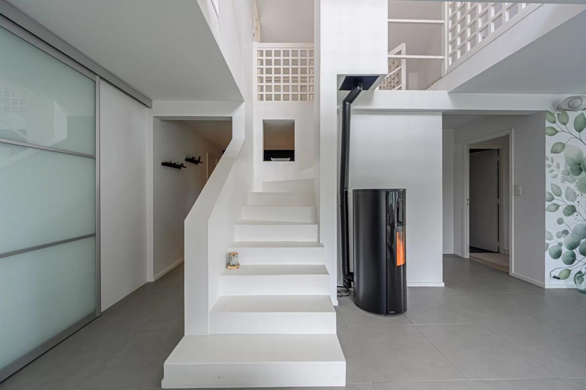 Elle offre une grande entrée avec dressing, une lumineuse pièce de vie orientée plein sud sur une belle terrasse sans vis à vis. Une grande cuisine de renom Bulthaup, un espace salon autour d’un poêle à pellet, un espace comtemporain arty.