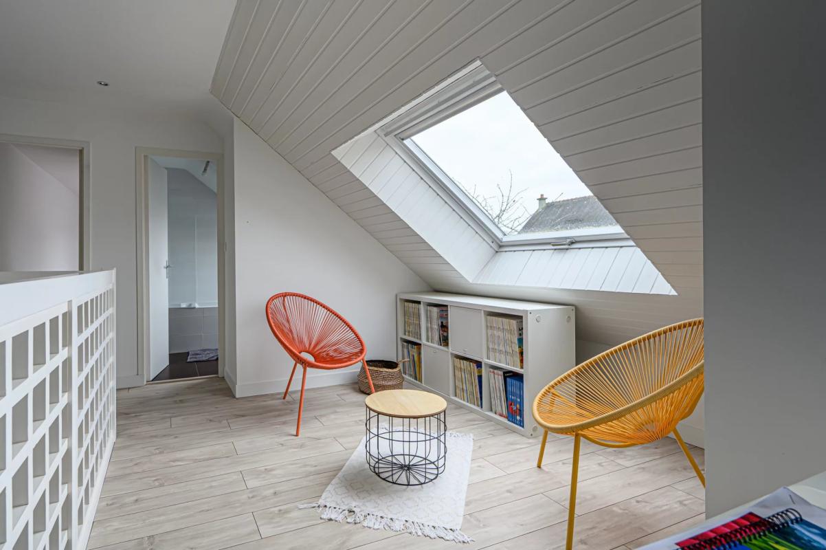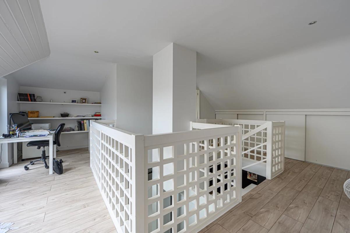 Par un escalier atypique, l’accès à une belle et spacieuse mezzanine desservant les trois chambres et salle d’eau.