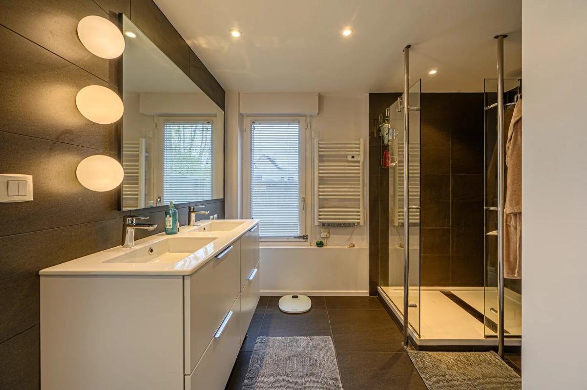 Une suite parentale en rez-de-chaussée avec une grande salle de douche. Une autre chambre est en rez-de-chaussée, une buanderie et des toilettes.