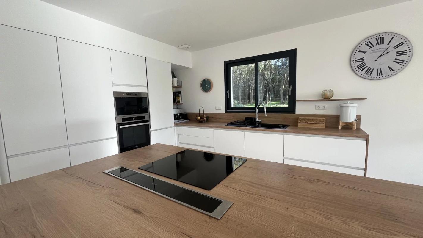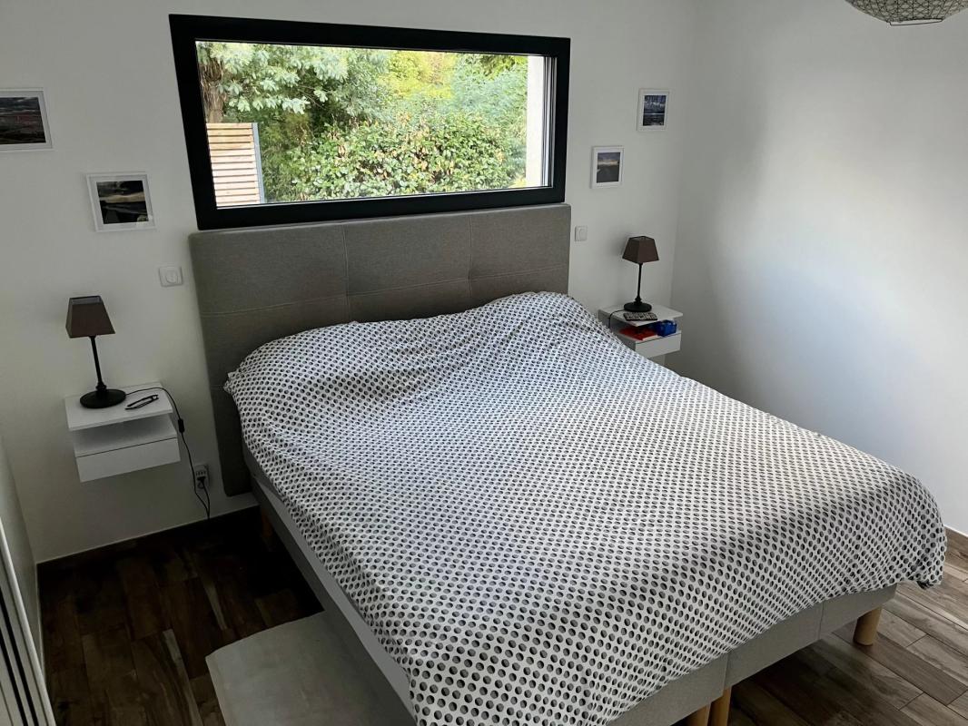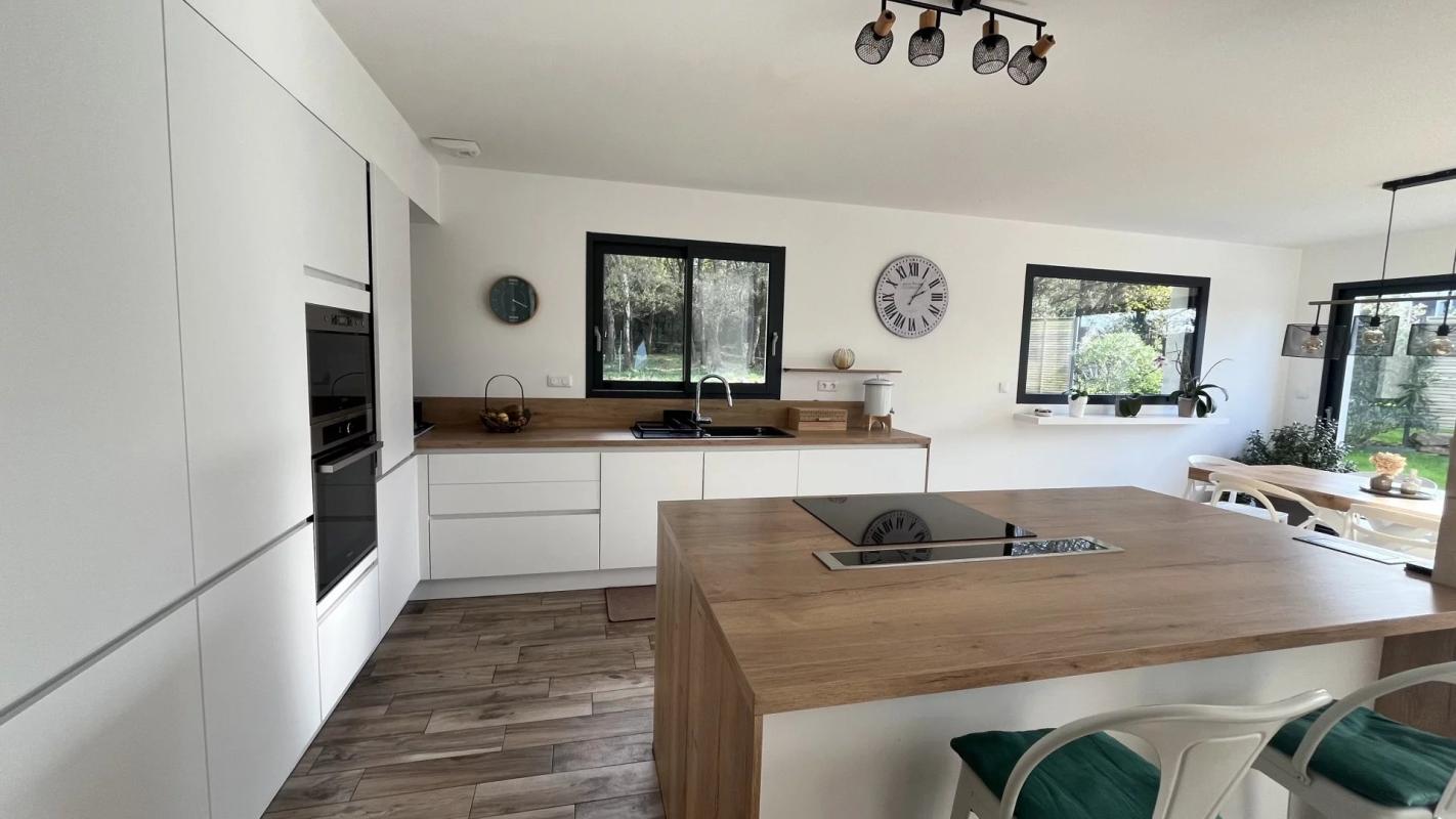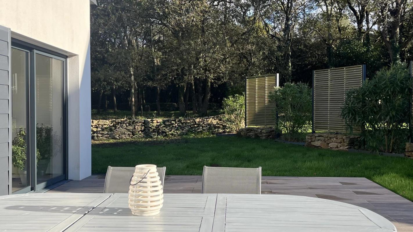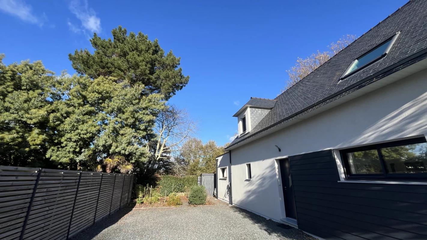 A pied des commerces et des plages de Larmor-Baden, cette maison contemporaine construite en 2022 d’environ 140 m² (154 utiles) se niche en fond d’impasse dans un bel environnement boisé.