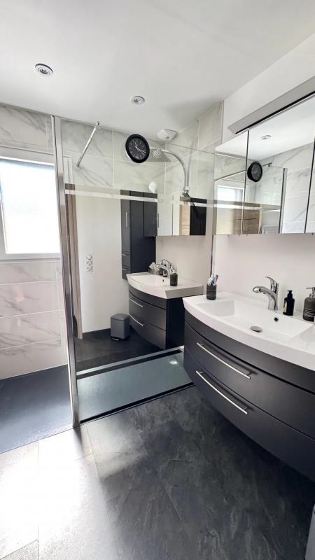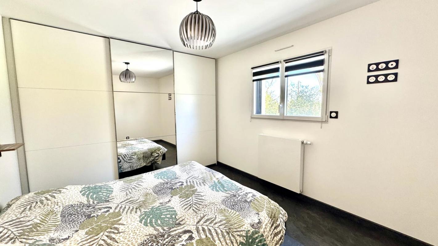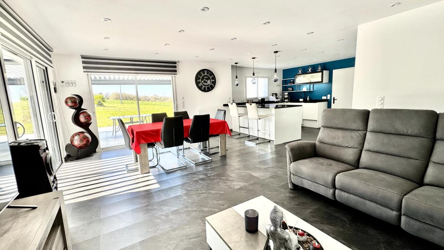 Maison de plain-pied construite en brique comprenant : une grande pièce de vie (46 m² ) exposée Sud et Ouest avec cuisine équipée et aménagée ( nombreux équipements : four, micro-onde et machine à café intégrés, hotte intégrée au plan de travail en granit …), 3 chambres dont une avec grand placard aménagé, SDE, WC.