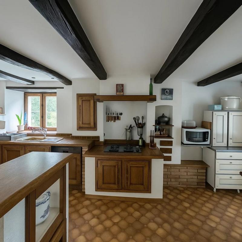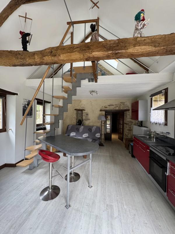 En RDC un gîte de 36 m² : pièce de vie poêle à bois avec cuisine, couchage en mezzanine, salle d’eau et wc .