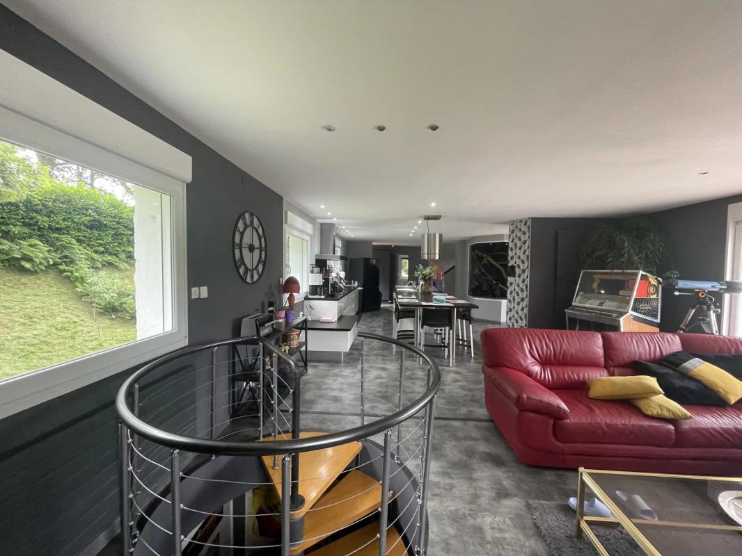 Une spacieuse terrasse de 100m² vous accueille, d’où vous profitez d’une vue surprenante sur la propriété. L’entrée s’ouvre sur une grande pièce de vie avec une cuisine ouverte très spacieuse, un salon avec un poêle s’ouvre sur la terrasse.