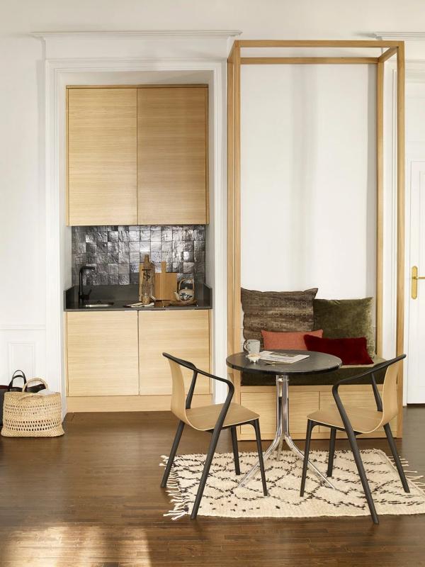 Vous y trouverez un grand lit confortable, ainsi qu’un coin séjour accueillant, pensé pour se relaxer en toute tranquillité. Un espace bureau discret et fonctionnel complète l’ensemble, parfait pour travailler dans un cadre inspirant. La cuisine, moderne et bien équipée, permet de préparer facilement vos repas au quotidien. Enfin, la salle d’eau, élégante, apporte tout le confort nécessaire.