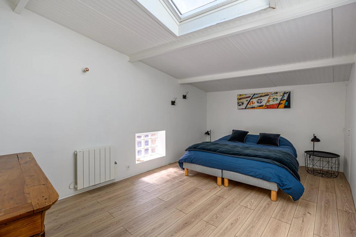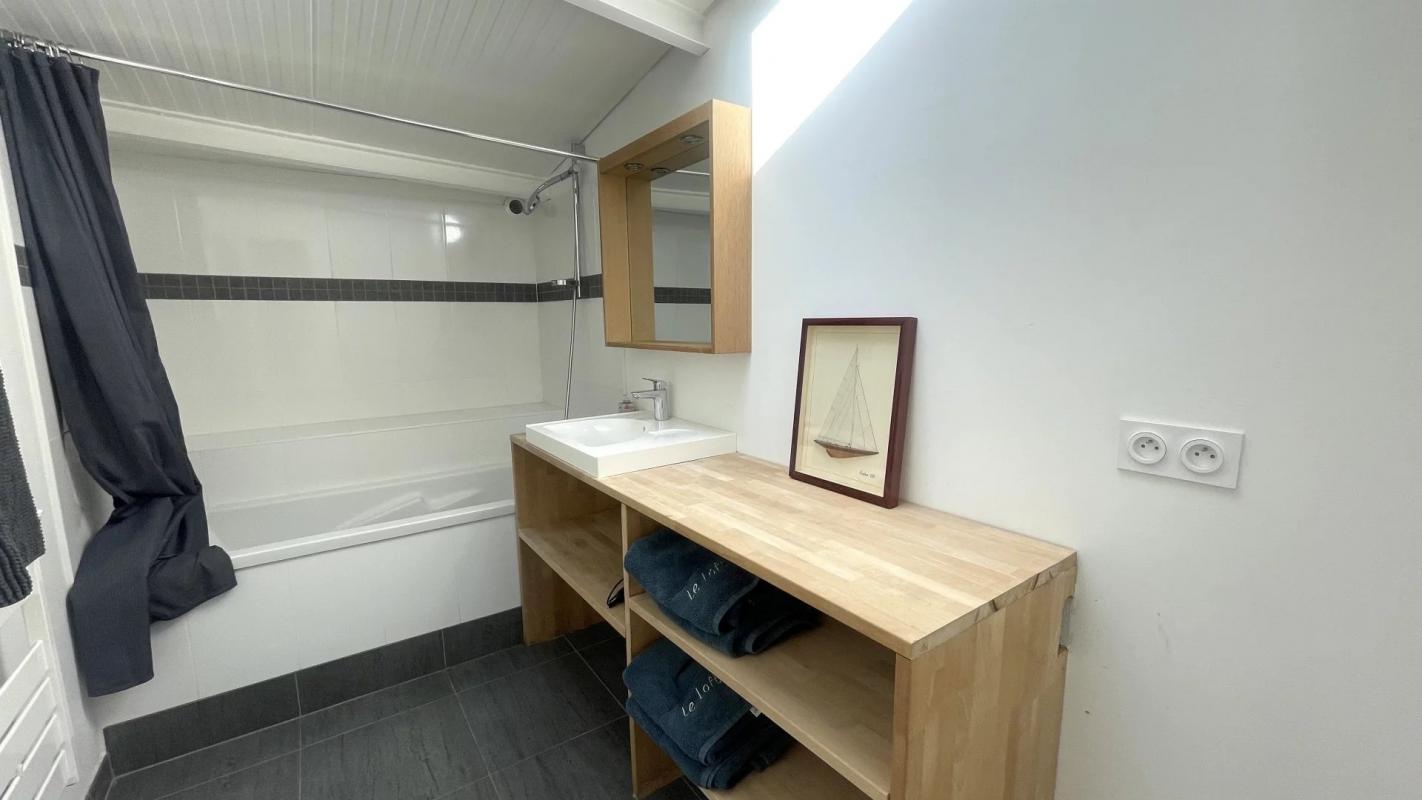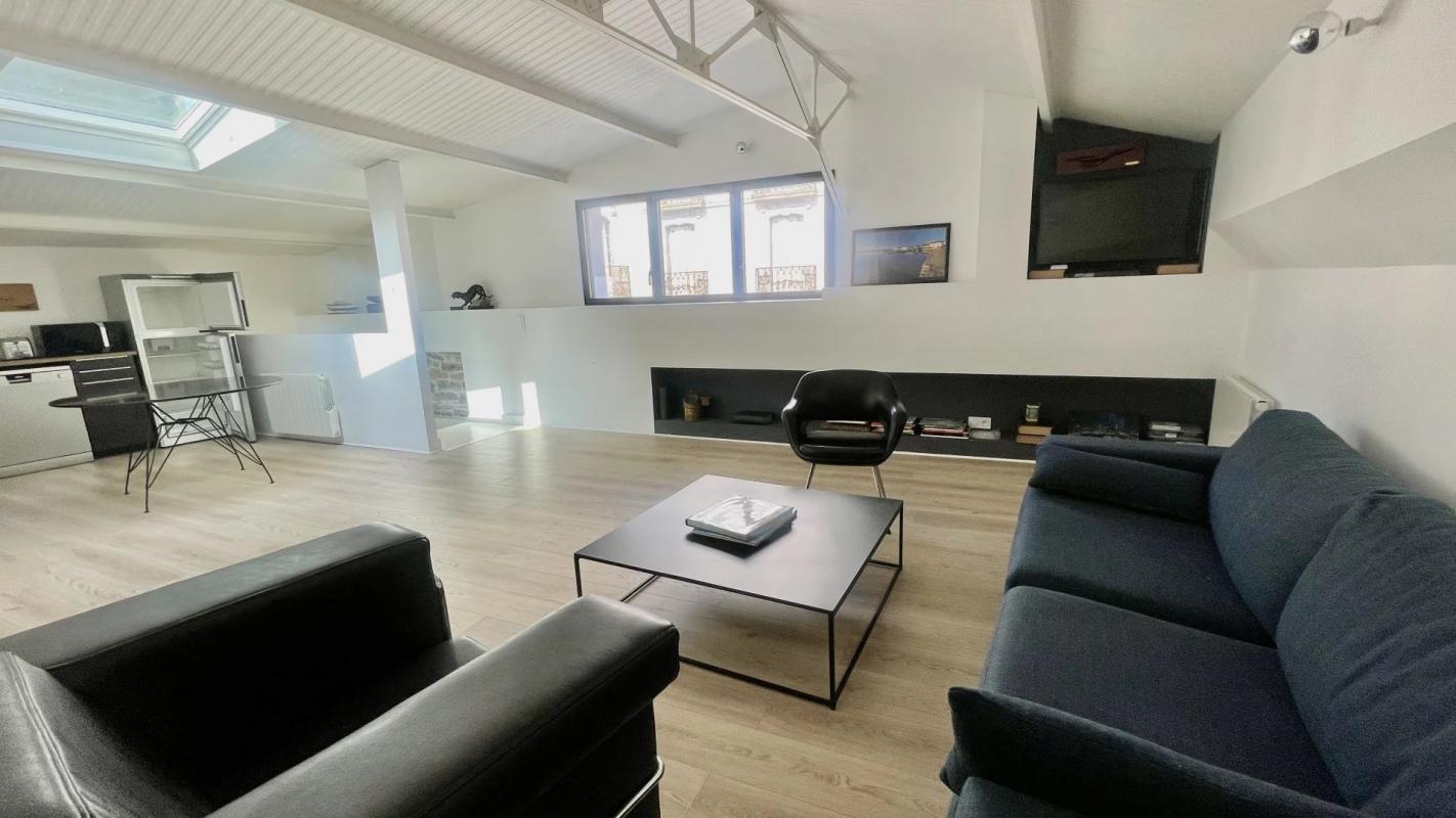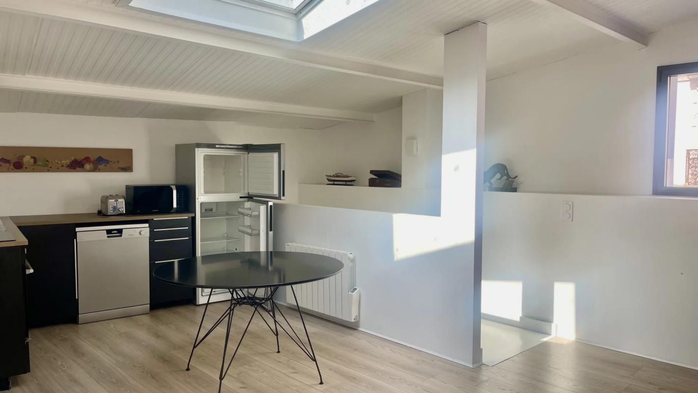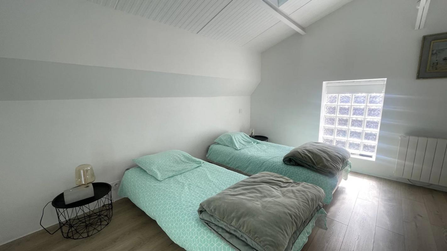 Au premier étage : Grande pièce de vie avec cuisine équipée et aménagée, deux chambres, une salle de bain et toilette.